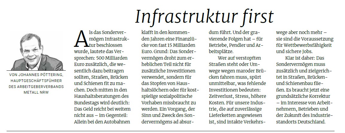 Klar ist daher: Das Sondervermögen muss zusätzlich und zielgerichtet in Straßen, Brücken- und Schienenbau fließen. Es braucht jetzt eine grundsätzliche Korrektur – im Interesse von Arbeitnehmern, Betrieben und der Zukunft des Industriestandorts Deutschland.