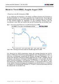 Volkswirtschaft/Statistik 25.08.2025 Metall im Trend (NRW), Ausgabe August 2025 I. Produktion in der M+E-Industrie in NRW Im Juni 2025 sank die Produktion in der Metall- und Elektro-Industrie…
