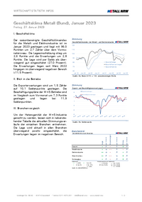 WIRTSCHAFT STATISTIK INFOS Geschäftsklima Metall (Bund), Januar 2023 Freitag, 27. Januar 2023 I. Geschäftsklima Der saisonbereinigte Geschäftsklimaindex für die Metall- und Elektroindustrie ist im…