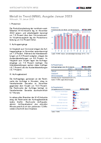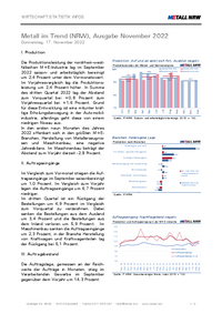 WIRTSCHAFT STATISTIK INFOS Metall im Trend (NRW), Ausgabe Januar 2023 Mittwoch, 18. Januar 2023 I. Produktion Die Produktionsleistung der nordrhein-westfälischen M+E-Industrie lag im November 2022…