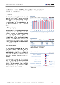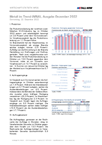 WIRTSCHAFT STATISTIK INFOS Metall im Trend (NRW), Ausgabe Februar 2023 Dienstag, 21. Februar 2023 I. Produktion Die Produktionsleistung der nordrhein-westfälischen M+E-Industrie lag im Dezember 2022…