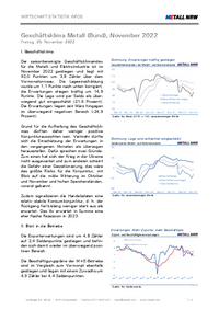 WIRTSCHAFT STATISTIK INFOS Geschäftsklima Metall (Bund), November 2022 Freitag, 25. November 2022 I. Geschäftsklima Der saisonbereinigte Geschäftsklimaindex für die Metall- und Elektroindustrie ist…